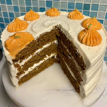If you're basic like me, then you love a pumpkin spice latte as soon as fall hits! My PSL cake tastes exactly like your favorite drink. Three layers of tender pumpkin spice cake including canned pumpkin, espresso powder and spices like cinnamon, ginger, cloves, allspice and even ground black pepper. Slathered with my famous whipped vanilla bean cream cheese frosting and cute orange pumpkins on top. Celebrate the season! 3-layer, 8-inch cake.