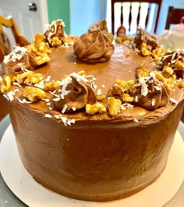 Tastes like the best candy bar you've ever had! Three supermoist dark chocolate cake layers, frosted with medium chocolate whipped American buttercream and layered between and on top with lots of toasted mixed walnuts and pecans. Toasting the nuts brings out a deep flavor and makes them super crunchy and toasty against the soft cake and frosting. Crunchy and satisfying! 3-layer, 8-inch, 24 cupcakes or 13X9 inch flat.