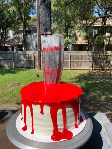 Muhahaha do you you DARE to have this cake at your Halloween party?! Three tender layers of red velvet cake slathered with whipped vanilla cream cheese frosting and dripped with actual blood (ok, it's corn syrup blood) and stabbed with a giant knife. Yes, you get to keep the knife! Don't like red velvet? Ask for chocolate or vanilla instead. 3-layer, 8-inch cake.