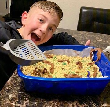 Love it or hate it, the Kitty Litter Cake is back, baby! It looks gross, but it tastes delicious. Moist vanilla buttermilk Texas sheet cake, frosted with vanilla buttercream and topped with crushed golden Oreos, a little bit of green food coloring (Fresh Step litter!) and some melted Tootsie Rolls for.. uh...decoration. Comes in actual brand new cat pan with cat scooper that you get to keep! 13X9 flat cake lined with parchment.