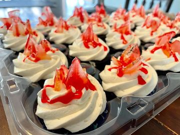 The perfect companion to the Dead Velvet cake at your Halloween party! They look scary but taste great. Soft dark chocolate cupcakes with black cocoa frosted with vanilla bean buttercream and topped with drizzled blood and sugar glass from scratch (not isomalt shortcut) so the glass is softer to the teeth. 24 cupcakes.