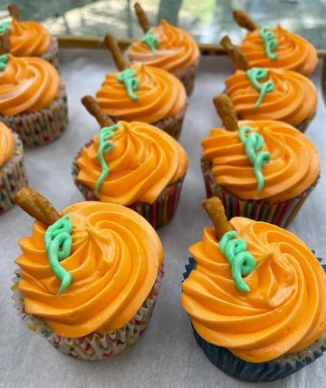 A great companion to the Strawberry Ghosties cake for your non-scary Halloween table! They'll love these adorable vanilla, fall-spiced cupcakes including freshly grated nutmeg, Saigon cinnamon, ginger, and cardamom, frosted with a swirl of whipped vanilla bean cream cheese frosting dyed orange and dressed up as cute little pumpkins with Dot's pretzel stems and frosting vines. 24 cupcakes. Not into fall spice? Pick another flavor.