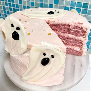 Not into spooky or gross-out vibes for Halloween? Try a sweet Strawberry Ghosties cake. Three tender layers of pink cake with pureed fresh strawberries in the batter, frosted with vanilla bean buttercream tinted light pink. Decorated for Halloween with marshmallow spiderwebs, white and gold deco and white chocolate ghosts. So sweet for a non-scary Halloween. 3-layer, 8-inch cake.