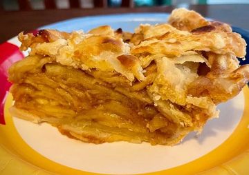 I've perfected apple pie by slicing six whole apples paper thin, spicing them with cinnamon, ginger, allspice and fresh grated nutmeg , then adding my secret ingredient - boiled down apple cider syrup, before tucking it into my famous, all-butter crunchy crust. Yum! It tastes just like McD apple pies from the 80s-90s. Topped with either pecan/oatmeal streusel or a second crust lattice with sparkle sugar, your choice.