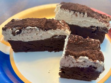 ABSOLUTE DECADENCE! An intensely chocolatey and fudgy brownie layer with background flaky salt notes making it sing. The topping of espresso-infused mascarpone whipped cream adds lightness and creaminess with the espresso powder enhancing the chocolate notes of the brownie. Finished with a dusting of Ghirardelli cocoa powder to look just like a tiramisu. Packaged in a 13X9 windowed box with 14X10 cake board. Small pieces go a long way, so serves 24.