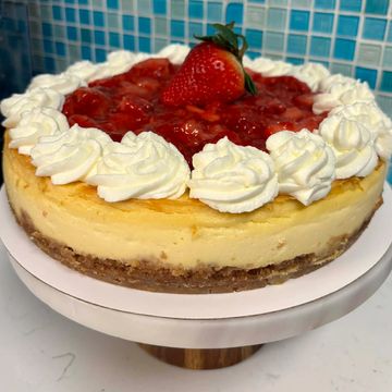 Cheesecake is finally on the menu! You get a 9" creamy, delicious, vanilla bean cheesecake incorporating 5 blocks of cream cheese, 7 eggs, heavy cream and more goodness. You'll love the baked and buttery graham cracker crust, topped with housemade strawberry compote using both fresh and frozen strawberries and decorated with stabilized whipped cream and a strawberry. Bonus: you also get a whole extra container of strawberry compote to top each slice! One 9" cheesecake.